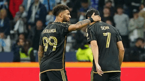 22일 벤쿠버 화이트캡스FC와의 경기에서 로스앤젤레스 FC의 손흥민 승부차기에서 승부차기에서 실패후 고개를 떨구자 동료 부앙가가 위로하고 있다./AFP연합뉴스