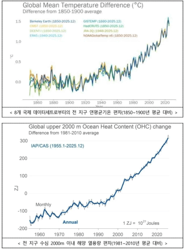 지구는 갈수록 더워지고 있다. 2015~2025년은 관측 이래 가장 더운 11개 해에 해당하고, 특히 2023~2025년의 최근 3년은 역대 가장 무더운 해 1~3위를 기록했다. 최근 3년 전지구 연평균기온 편차(산업화 이전 대비 기온 상승폭)는 2023년 1.45±0.12도, 2024년 1.55±0.13도, 2025년 1.44±0.13도이다.
